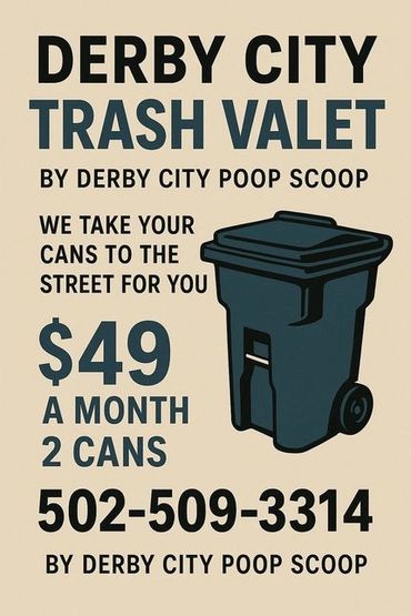You already trust our team at Derby City Poop Scoop—now let us handle another dirty job for you! Introducing Derby City Trash Can Valet, a hassle-free, monthly subscription service that takes your trash cans from the house to the curb and back, so you don’t have to.